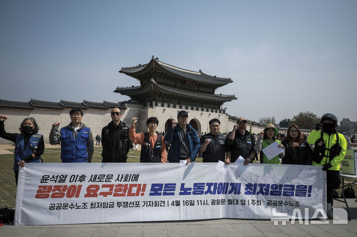 [서울=뉴시스] 정병혁 기자 =14일 서울 종로구 광화문 월대에서 열린 공공운수노조 최저임금 투쟁 선포 기자회견에서 공공운수노조 조합원들이 구호를 외치고 있다. 2025.04.16. [email protected]