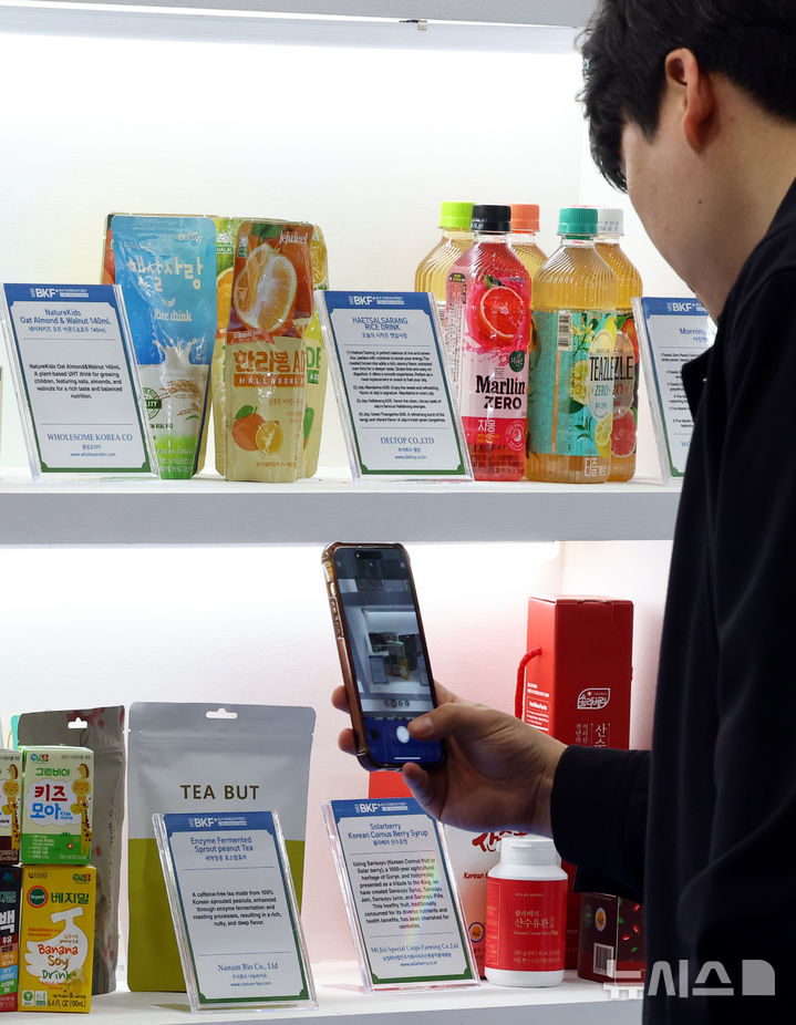 [서울=뉴시스] 박주성 기자 = 16일 서울 양재동 aT센터에서 열린 K-Food+ 바이어 초청 수출상담회에서 외국 바이어들이 한국 가공식품들을 둘러보고 있다. 2025.04.16. [email protected]