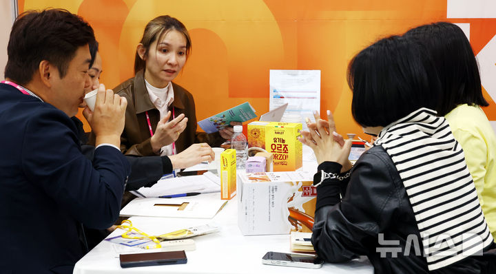 [서울=뉴시스] 박주성 기자 = 16일 서울 양재동 aT센터에서 열린 K-Food+ 바이어 초청 수출상담회에서 외국 바이어들이 한국 가공식품들과 관련해 설명을 듣고 있다. 2025.04.16. [email protected]