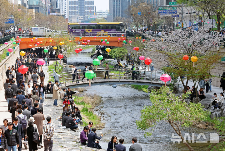 [서울=뉴시스] 김금보 기자 = 평년 기온을 회복하며 완연한 봄 날씨를 보인 16일 서울 중구 청계천에서 시민들이 휴식을 취하고 있다. 2025.04.16. [email protected]