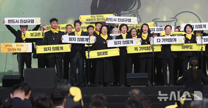 [안산=뉴시스] 김종택 기자 = 16일 오후 경기 안산시 화랑유원지에서 열린 '세월호참사 11주기 기억식'에서 416합창단의 기억 합창 공연이 열리고 있다. (공동취재) 2025.04.16. [email protected]