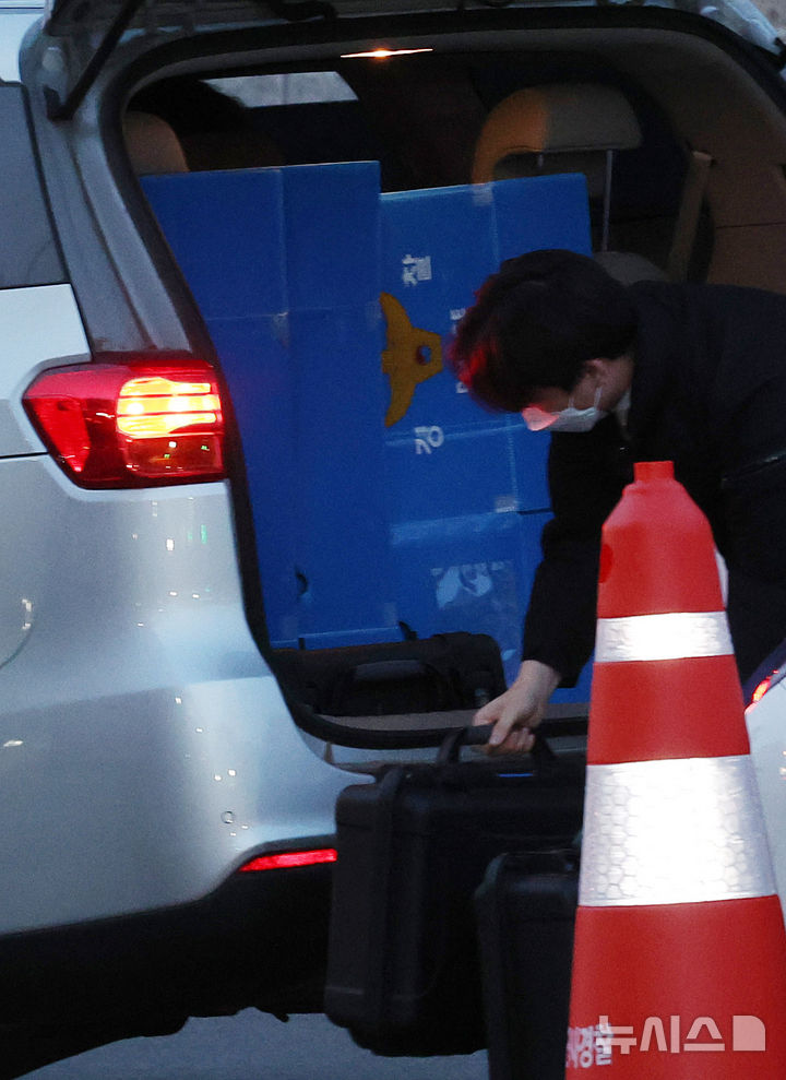 [서울=뉴시스] 조수정 기자 = 경찰 비상계엄 특별수사단이 16일 서울 용산 대통령실 청사에서 압수수색을 시도하며 차량의 포렌식 장비를 다른 차량으로 옮겨싣고 있다. 2025.04.16. [email protected]