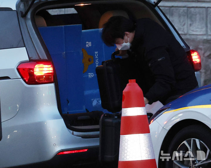 [서울=뉴시스] 조수정 기자 = 경찰 비상계엄 특별수사단이 16일 서울 용산 대통령실 청사에서 압수수색을 시도하며 차량의 포렌식 장비를 다른 차량으로 옮겨싣고 있다. 2025.04.16. [email protected]