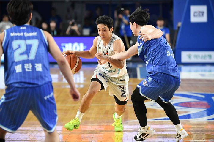 [서울=뉴시스] 16일 대구체육관에서 열린 2024-2025 KBL 6강 플레이오프 대구 한국가스공사와 수원 KT의 경기, KT 허훈이 돌파를 시도하고 있다. (사진=KBL 제공) 2025.04.16. [email protected] *재판매 및 DB 금지