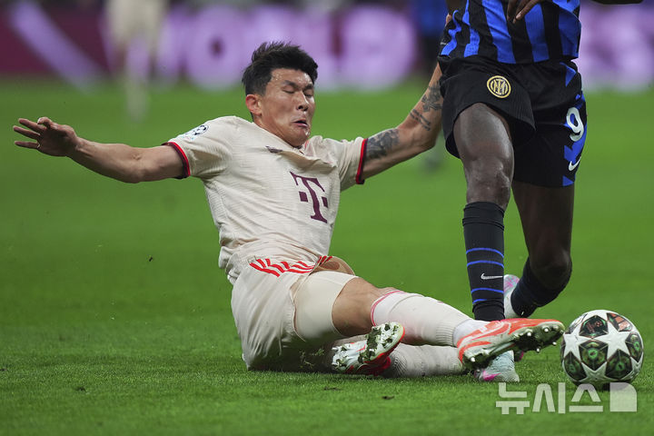 [밀라노=AP/뉴시스] 바이에른 뮌헨(독일)의 김민재가 16일(현지 시간) 이탈리아 북부 밀라노의 스타디오 주세페 메아차에서 열린 2024-25 유럽축구연맹(UEFA) 챔피언스리그(UCL) 8강 2차전 인터 밀란과의 경기 전반 28분 마르쿠스 튀랑에게 태클을 시도하고 있다. 김민재는 이 태클로 경고를 받는 등 65분을 소화했고 뮌헨은 2-2로 비겼으나 1,2차전 합계 3-4로 밀리며 4강에 오르지 못했다. 2025.04.17.