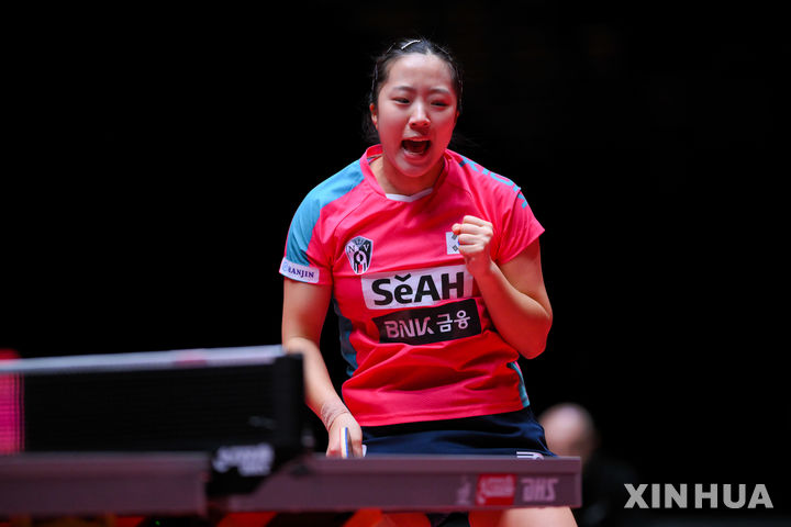 [마카오=신화/뉴시스] 신유빈이 16일(현지 시간) 중국 마카오 갤럭시 아레나에서 열린 2025 국제탁구연맹(ITTF) 월드컵 여자 단식 조별 리그 12조 2차전에서 사마라 엘리자베타(루마니아)와 경기하고 있다. 신유빈이 4-0(11-4 11-3 11-5 11-9)으로 승리해 2연승을 기록하며 조 1위로 16강에 진출했다. 2025.04.17.