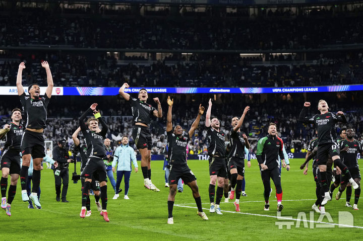 [마드리드=AP/뉴시스] 아스널(영국) 선수들이 16일(현지 시간) 스페인 마드리드의 산티아고 베르나베우에서 열린 2024-25 유럽축구연맹(UEFA) 챔피언스리그(UCL) 8강 2차전에서 레알 마드리드를 꺾은 후 팬들에게 인사하고 있다. 아스널이 2-1로 승리해 1,2차전 합계 5-1을 기록하며 4강에 진출했다. 2025.04.17.