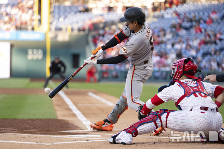 [필라델피아=AP/뉴시스] 샌프란시스코 자이언츠의 이정후가 16일(현지 시간) 미 펜실베이니아주 필라델피아의 시티즌스 뱅크 파크에서 열린 2025 메이저리그(MLB) 필라델피아 필리스와의 경기 1회 초 윌리 아다메스를 홈으로 불러들이는 적시타를 치고 있다. 2025.04.17.