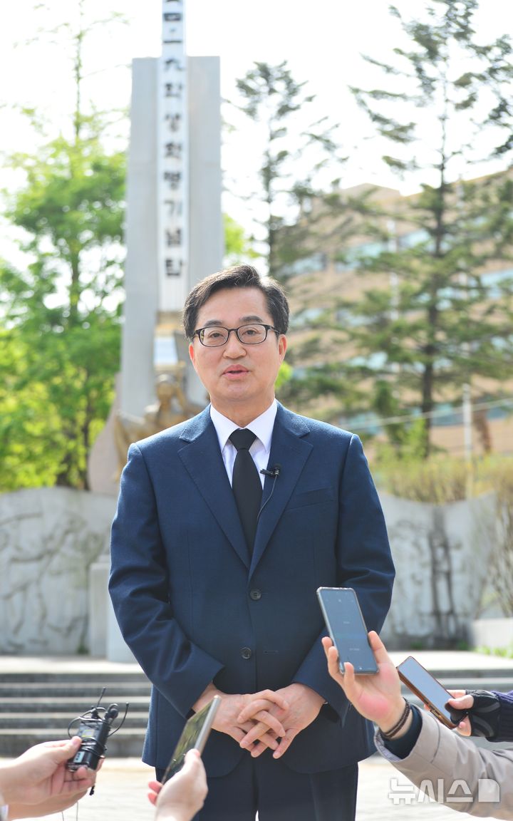 [청주=뉴시스] 서주영 기자 = 김동연 경기도지사가 17일 충북 청주시 상당공원에서 4·19학생혁명기념탑에 참배한 뒤 발언하고 있다. 2025.04.17. [email protected]