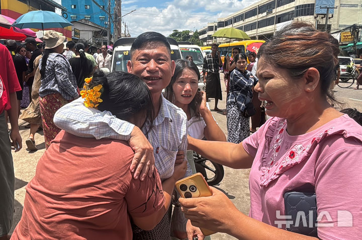 [양곤=AP/뉴시스] 17일(현지 시간) 미얀마 양곤 인세인 교도소 앞에서 석방된 수감자(가운데)가 가족과 재회하고 있다. 민 아울 흘라잉 미얀마 군정 수장은 이날 전통 새해를 맞아 외국인 13명 포함, 4893명의 수감자를 사면했다. 2025.04.17.