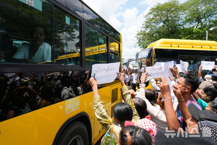 [양곤=AP/뉴시스] 17일(현지 시간) 미얀마 양곤 인세인 교도소 앞에서 수감자 가족들이 사면으로 풀려난 수감자들의 버스 앞에 모여 가족을 찾고 있다. 민 아울 흘라잉 미얀마 군정 수장은 이날 전통 새해를 맞아 외국인 13명 포함, 4893명의 수감자를 사면했다. 2025.04.17.