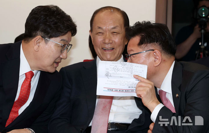 [서울=뉴시스] 국회사진기자단 = 17일 서울 여의도 국민의힘 중앙당사에서 열린 제21대 대통령선거 '1차 경선 토론회 미디어데이' 행사에서 권성동(왼쪽부터) 원내대표와 황우여 선거관리위원장, 이양수 사무총장이 대화하고 있다. 2025.04.17. [email protected]