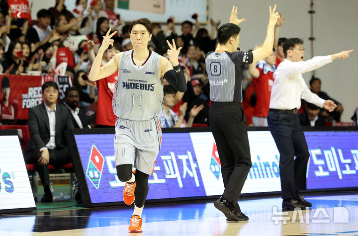 [안양=뉴시스] 이영환 기자 = 17일 안양 동안구 정관장 아레나에서 열린 2024-2025 프로농구 6강 플레이오프 3차전 울산 현대모비스 피버스와 안양 정관장 레드부스터스의 경기 2쿼터, 현대모비스 이우석이 삼점슛을 넣은 후 기뻐하고 있다. 2025.04.17. [email protected]