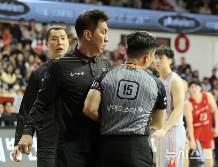 [안양=뉴시스] 이영환 기자 = 17일 안양 동안구 정관장 아레나에서 열린 2024-2025 프로농구 6강 플레이오프 3차전 울산 현대모비스 피버스와 안양 정관장 레드부스터스의 경기 2쿼터, 정관장 김상식 감독이 심판에게 항의를 하고 있다. 2025.04.17. [email protected]