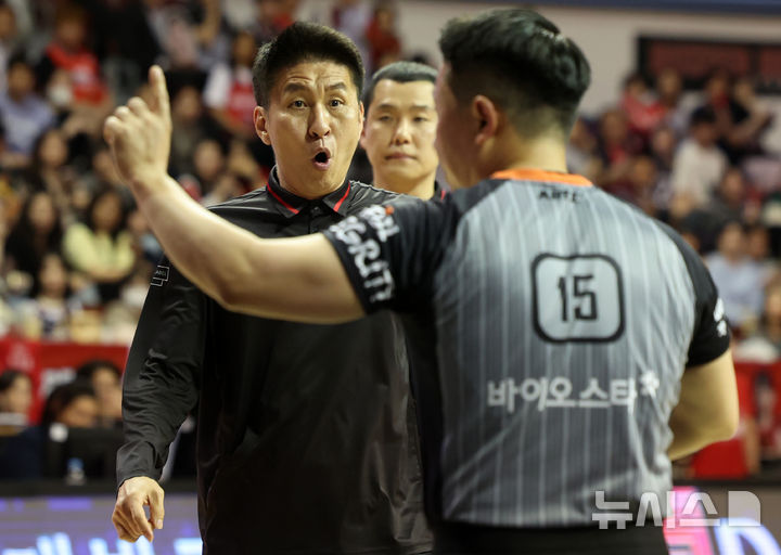 [안양=뉴시스] 이영환 기자 = 17일 안양 동안구 정관장 아레나에서 열린 2024-2025 프로농구 6강 플레이오프 3차전 울산 현대모비스 피버스와 안양 정관장 레드부스터스의 경기 2쿼터, 정관장 김상식 감독이 심판에게 항의를 하고 있다. 2025.04.17. [email protected]