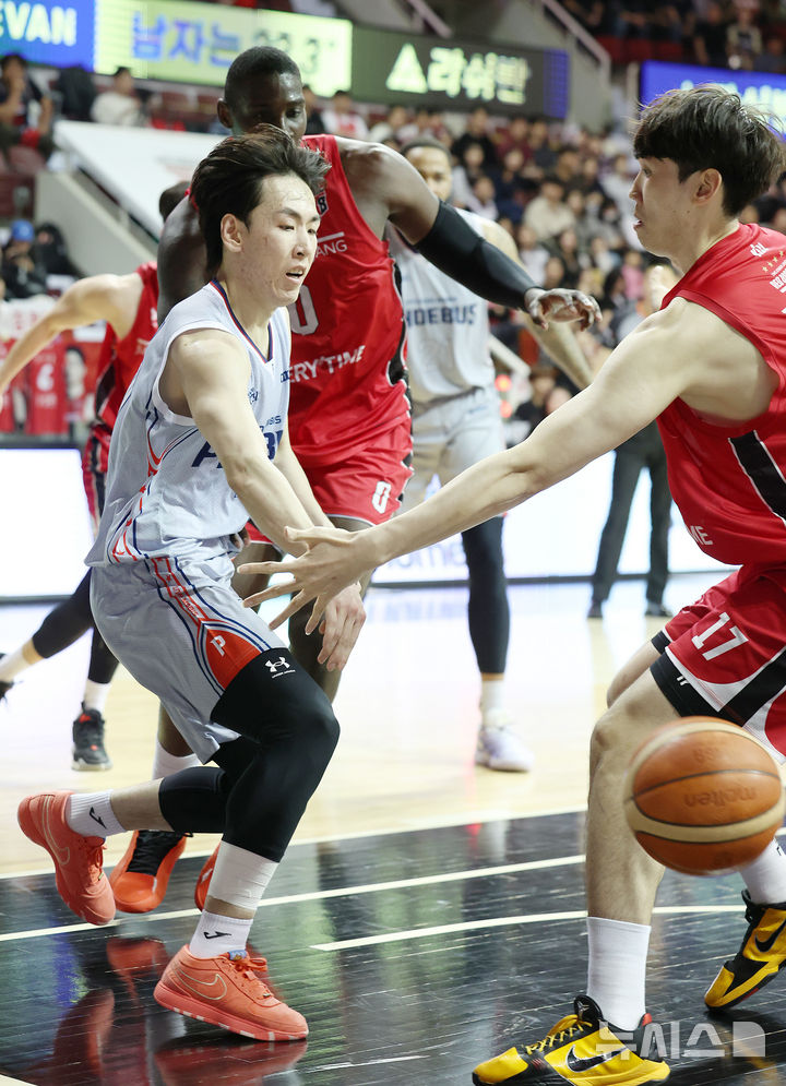 [안양=뉴시스] 이영환 기자 = 17일 안양 동안구 정관장 아레나에서 열린 2024-2025 프로농구 6강 플레이오프 3차전 울산 현대모비스 피버스와 안양 정관장 레드부스터스의 경기 3쿼터, 현대모비스 서명진이 정관장 김경원의 수비를 피해 패스를 하고 있다. 2025.04.17. [email protected]