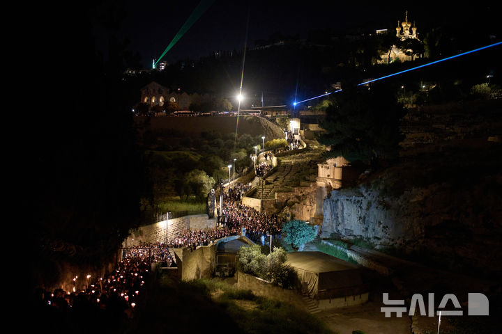[예루살렘=AP/뉴시스] 17일(현지 시간) 예루살렘 구시가지 외곽에서 열린 성주간(Holy Week) 행사 중 신도들이 예수가 재판을 받으러 갔던 길로 여겨지는 '비아 돌로로사'(고통의 길)을 따라 촛불 행진을 하고 있다. '성주간'은 예수의 고난과 부활 전까지의 마지막 주간을 가리킨다. 2025.04.18.