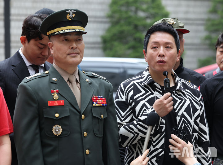 [서울=뉴시스] 김금보 기자 = 임태훈 군인권센터 소장이 18일 서울 서초구 서울고등법원에서 열린 박정훈 전 해병대 수사단장(대령)의 항명 등 혐의 항소심 공판준비기일 출석길 기자회견에서 발언을 하고 있다. 2025.04.18. [email protected]