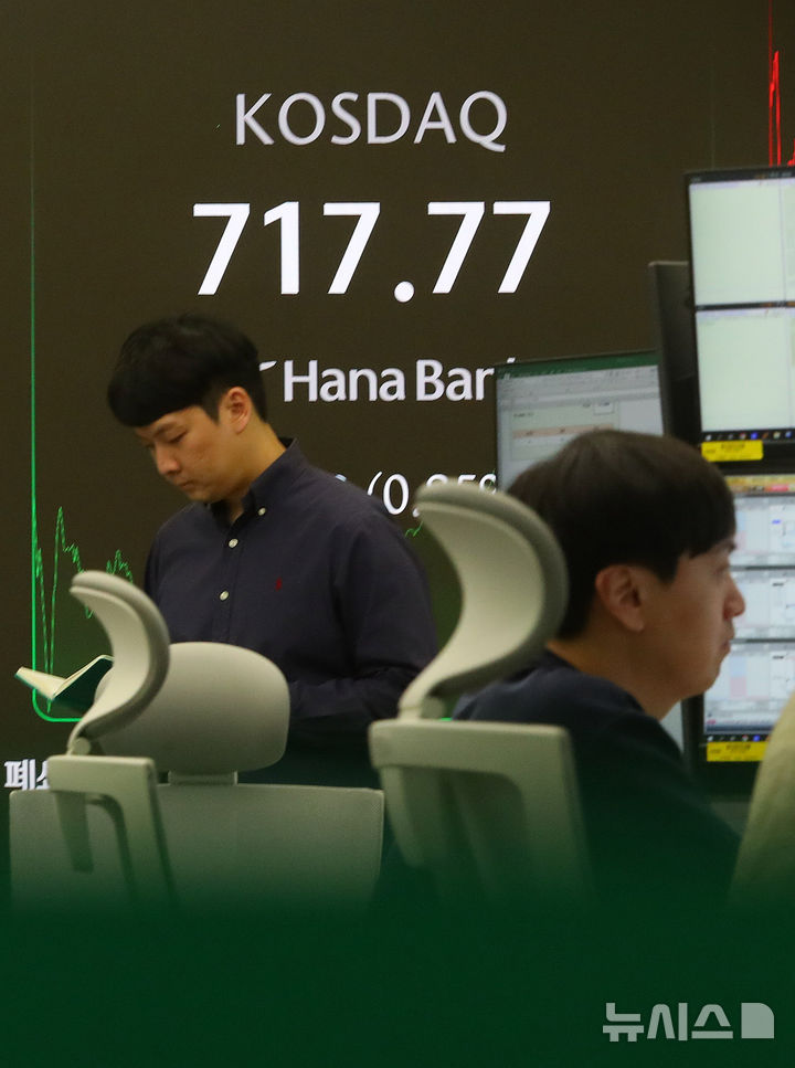 [서울=뉴시스] 김혜진 기자 = 코스닥 지수가 전 거래일(711.75)보다 6.02포인트(0.85%) 상승한 717.77에 장을 마감한 18일 오후 서울 중구 하나은행 딜링룸 전광판에 지수가 표시 되고 있다.