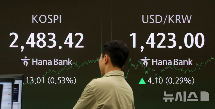 [서울=뉴시스] 김혜진 기자 = 코스피가 전 거래일(2470.41)보다 13.01포인트(0.53%) 오른 2483.42에 장을 마감한 18일 오후 서울 중구 하나은행 딜링룸 전광판에 지수가 표시 되고 있다.