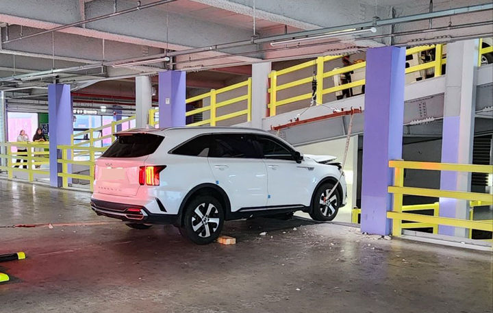 순천 주차타워 난간 돌진 SUV 차량