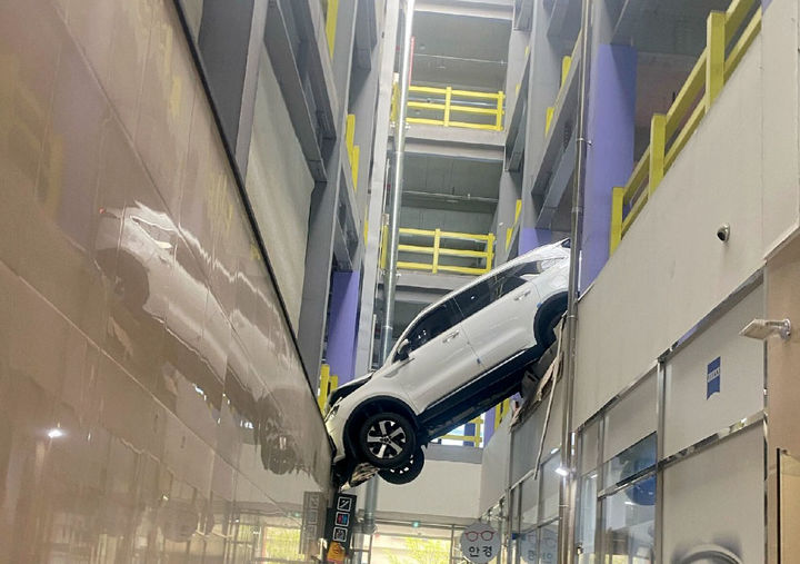 [순천=뉴시스] 변재훈 기자 = 18일 오후 전남 순천시 오천동의 한 주차타워 2층에서 SUV 차량이 돌진하는 사고가 발생해 차량이 난간에 걸쳐져 있다. 운전자는 무사 구조됐다. (사진=순천소방 제공) 2025.04.18. [email protected]