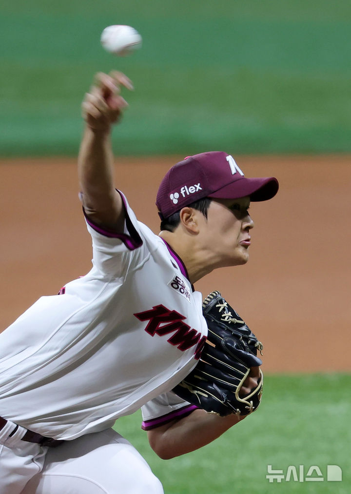 [서울=뉴시스] 홍효식 기자 = 18일 서울 구로구 고척스카이돔에서 열린 2025 KBO리그 kt 위즈와 키움 히어로즈의 경기, 1회초 키움 히어로즈 선발투수 전준표가 역투하고 있다. 2025.04.18. [email protected]