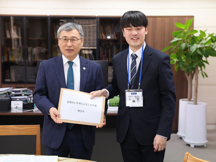 [서울=뉴시스] 이영환 기자 = 정근식 서울시교육감이 18일 오후 서울 종로구 서울시교육청에서 열린 장애인 교원의 교육활동 보호 및 실질적인 지원 방안을 위한 간담회에서 제안서를 받고 있다. (사진=서울시교육청 제공) 2025.04.18. [email protected] *재판매 및 DB 금지