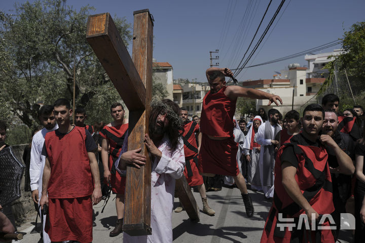[쿠라예=AP/뉴시스] 18일(현지 시간) 레바논 남부 항구 도시 시돈 인근 쿠라예 마을에서 성금요일 의식의 일환으로 십자가를 진 남성이 예수 그리스도의 수난을 재현하고 있다. 2025.04.19.