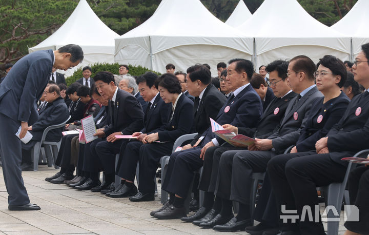 [서울=뉴시스] 조수정 기자 = 한덕수 대통령 권한대행 국무총리가 19일 서울 강북구 국립 4·19민주묘지에서 제65주년 4·19 혁명 기념사를 마친 뒤 인사하고 있다. (대통령실통신사진기자단) 2025.04.19. [email protected]