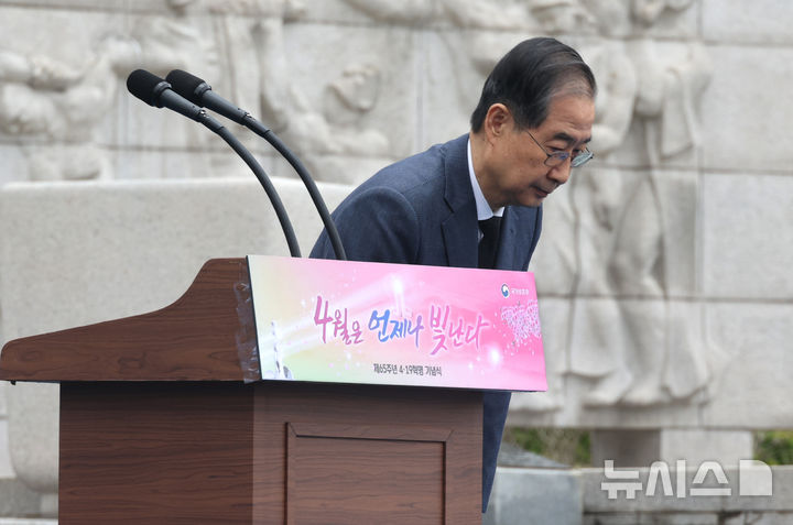[서울=뉴시스] 조수정 기자 = 한덕수 대통령 권한대행 국무총리가 19일 서울 강북구 국립 4·19민주묘지에서 열린 제65주년 4·19 혁명 기념식에서 기념사를 마친 뒤 인사하고 있다. (대통령실통신사진기자단) 2025.04.19. [email protected]