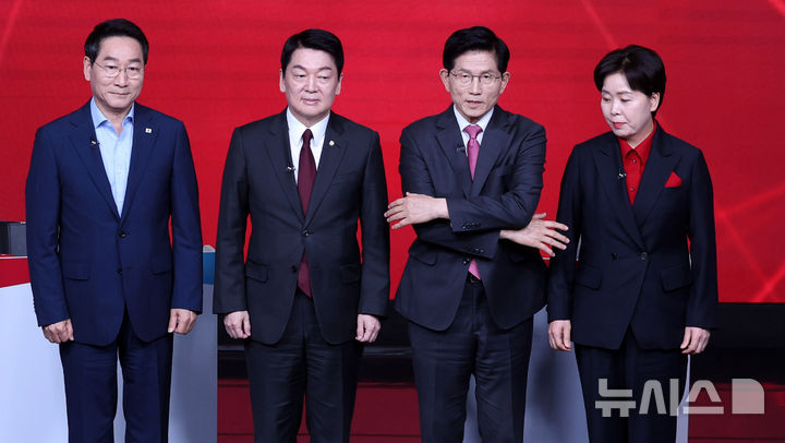 [서울=뉴시스] 추상철 기자 = 유정복(왼쪽부터), 안철수, 김문수, 양향자 제21대 대통령 선거 국민의힘 경선 후보가 19일 오후 서울 강서구 ASSA아트홀에서 열린 '제21대 대통령 선거 국민의힘 1차 경선 A조 토론회'에서 토론 시작전 기념촬영 준비를 하고 있다. 2025.04.19. [email protected]