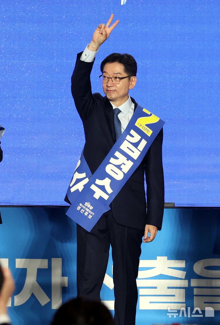 [청주=뉴시스] 조성봉 기자= 김경수 더불어민주당 대선 경선 후보가 19일 오후 충북 청주시 서원구 청주체육관에서 열린 제21대 대통령선거 후보자 선출을 위한 충청권 합동연설회에서 지지자들에게 인사하고 있다. 2025.04.19. [email protected]