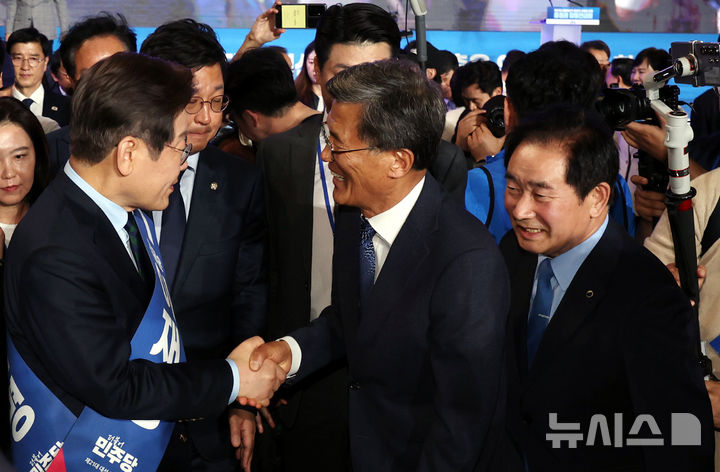 [청주=뉴시스] 조성봉 기자= 이재명 제21대 대통령 선거 더불어민주당 경선 후보가 19일 오후 충북 청주시 서원구 청주체육관에서 열린 제21대 대통령선거 후보자 선출을 위한 충청권 합동연설회에서 1위를 기록, 지지자들과 인사를 하고 있다. 2025.04.19. [email protected]