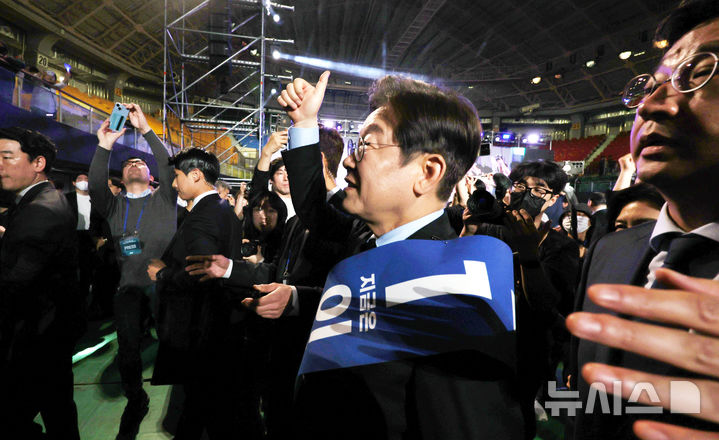 [청주=뉴시스] 조성봉 기자= 이재명 제21대 대통령 선거 더불어민주당 경선 후보가 19일 오후 충북 청주시 서원구 청주체육관에서 열린 제21대 대통령선거 후보자 선출을 위한 충청권 합동연설회에서 1위를 기록, 지지자들에게 인사를 하고 있다. 2025.04.19. [email protected]