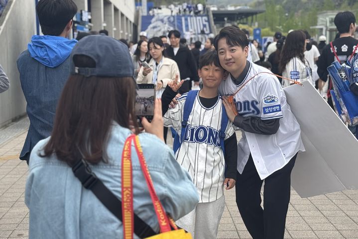 [서울=뉴시스] 조성봉 기자= 이준석 개혁신당 제21대 대통령선거 후보가 20일 대구 수성구 삼성라이온즈파크에서 삼성 응원유니폼을 입은 어린이와 함께 기념촬영을 하고 있다. (사진=이준석 캠프 제공)