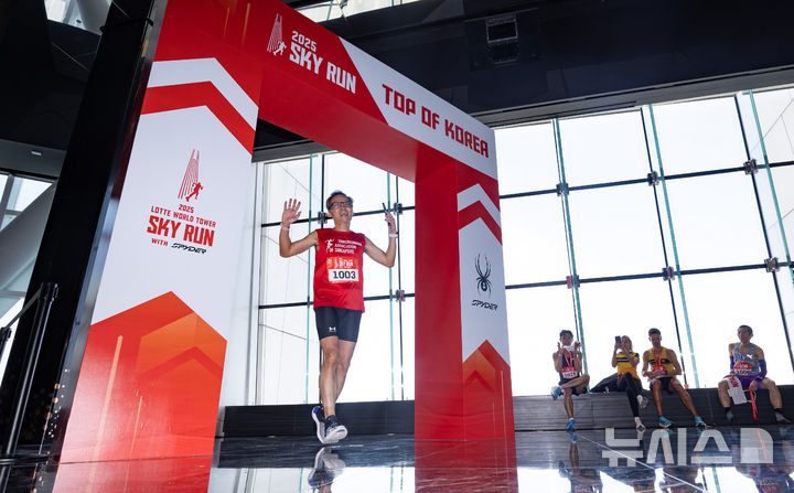[서울=뉴시스] 황준선 기자 = 20일 오전 서울 송파구 롯데월드타워에서 열린 '2025 롯데월드타워 스카이런 with SPYDER'에서 참가자가 결승선을 통과하고 있다. 2025.04.20. [email protected]
