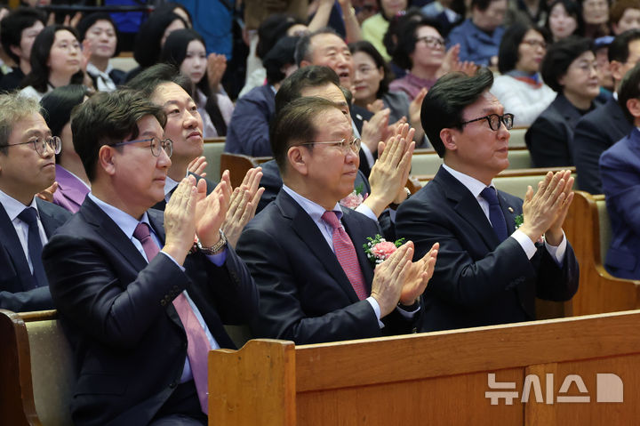 [서울=뉴시스] 권창회 기자 = 권영세 국민의힘 비상대책위원장과 권성동 원내대표, 김민석 더불어민주당 최고위원이 20일 서울 강남구 광림교회에서 열린 2025 한국교회 부활절 연합예배에서 박수치고 있다. 2025.04.20. [email protected]