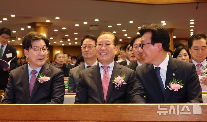 [서울=뉴시스] 권창회 기자 = 권영세 국민의힘 비상대책위원장과 권성동 원내대표, 김민석 더불어민주당 최고위원이 20일 서울 강남구 광림교회에서 열린 2025 한국교회 부활절 연합예배에서 대화하고 있다. 2025.04.20. [email protected]