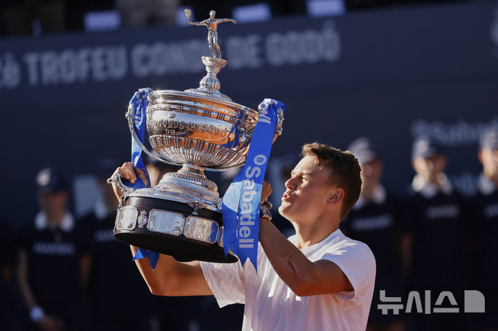 [바르셀로나=AP/뉴시스] 홀게르 루네(13위·덴마크)가 20일(현지 시간) 스페인 바르셀로나에서 열린 남자프로테니스(ATP) 투어 바르셀로나 오픈(ATP500) 정상에 올라 트로피를 들고 포즈를 취하고 있다. 루네는 결승전에서 카를로스 알카라스(2위·스페인)를 2-0(7-6 6-2)으로 꺾고 우승컵을 들어 올렸다. 2025.04.21.