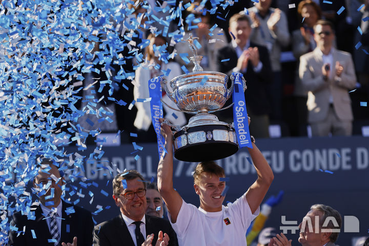 [바르셀로나=AP/뉴시스] 홀게르 루네(13위·덴마크)가 20일(현지 시간) 스페인 바르셀로나에서 열린 남자프로테니스(ATP) 투어 바르셀로나 오픈(ATP500) 정상에 올라 트로피를 들고 포즈를 취하고 있다. 루네는 결승전에서 카를로스 알카라스(2위·스페인)를 2-0(7-6 6-2)으로 꺾고 우승컵을 들어 올렸다. 2025.04.21.
