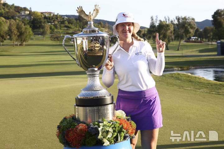 [로스앤젤레스=AP/뉴시스] 잉리드 린드블라드(스웨덴)가 20일(현지 시간) 미 캘리포니아주 로스앤젤레스의 엘 카바예로 컨트리클럽에서 열린 미국여자프로골프(LPGA) 투어 JM 이글 LA 챔피언십 정상에 올라 트로피와 함께 포즈를 취하고 있다. 린드블라드는 최종 합계 21언더파 267타로 이와이 아키에(일본)를 1타 차로 제치고 생애 첫 투어 우승의 기쁨을 누렸다. 2025.04.21.