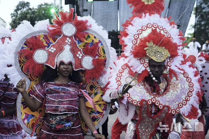 [라고스=AP/뉴시스] 20일(현지 시간) 나이지리아 라고스에서 '판티 카니발'이 열려 참가자들이 춤추고 있다. 아프로-브라질 유산을 기념하는 판티 카니발은 화려한 의상과 퍼레이드, 전통 음악과 춤을 통해 아프로-브라질 문화의 정체성과 공동체 정신을 표현하며 나이지리아에서 가장 오래되고 상징적인 문화 축제로 평가받고 있다. 2025.04.21.