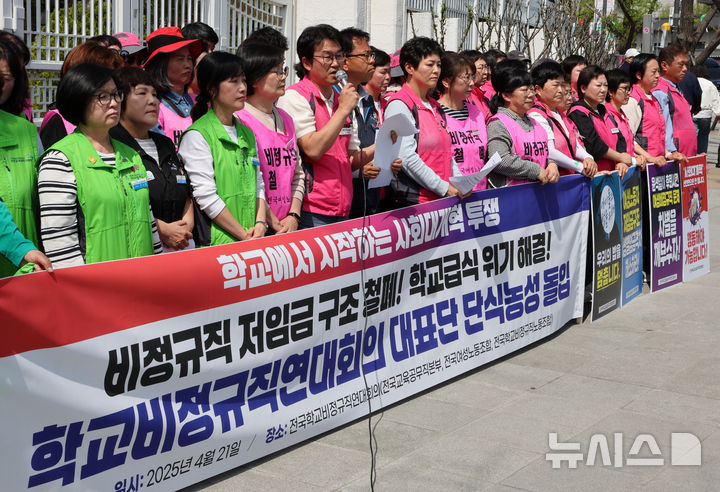 [서울=뉴시스] 배훈식 기자 = 전국학교비정규직연대회의 조합원들이 21일 오전 서울 종로구 정부서울청사 앞에서 단식농성 돌입 기자회견을 열고 비정규직 저임금 구조 철폐와 학교급식 위기 해결을 촉구하고 있다. 2025.04.21. [email protected]