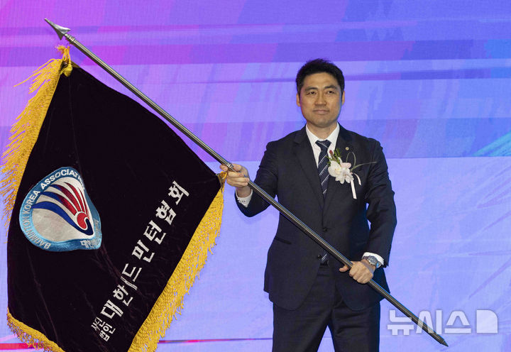 [서울=뉴시스] 김근수 기자 = 김동문 제32대 신임 대한배드민턴협회장이 21일 서울 송파구 올림픽파크텔에서 열린 제32대 대한배드민턴협회장 취임식에서 협회기를 들고 있다. 2025.04.21. [email protected]