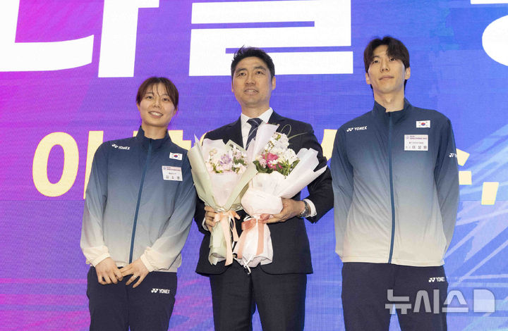 [서울=뉴시스] 김근수 기자 = 김동문 신임 대한배드민턴협회장이 21일 서울 송파구 올림픽파크텔에서 열린 제32대 대한배드민턴협회장 취임식에서 이상원, 김소영 배드민턴 국가대표 선수들에게 꽃다발을 받고 기념촬영을 하고 있다. 2025.04.21. [email protected]