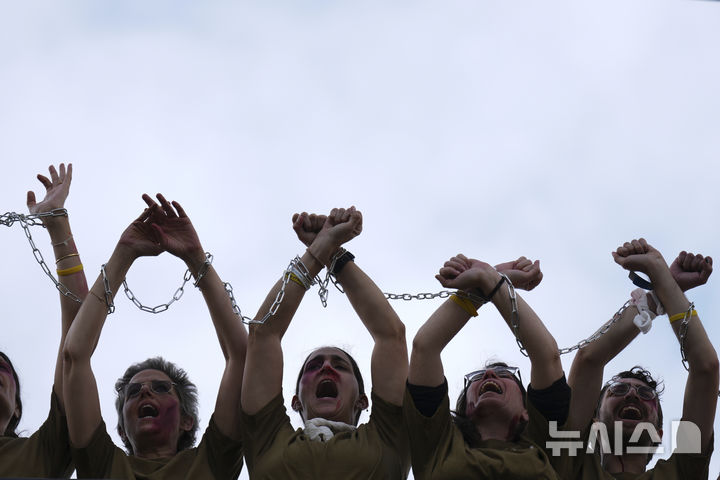 [텔아비브=AP/뉴시스] 21일(현지 시간) 이스라엘 텔아비브에서 가짜 피 등으로 분장한 활동가들이 서로의 손을 사슬로 묶은 채 2023년 10월 7일 키부츠 나할 오즈에서 하마스 무장 세력에 납치된 이스라엘 병사 마탄 앙그레스트의 석방을 촉구하고 있다. 2025.04.22.