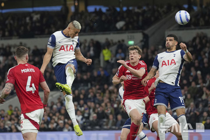 [런던=AP/뉴시스] 토트넘 홋스퍼의 히샤를리송이 21일(현지 시간) 영국 런던의 토트넘 홋스퍼 스타디움에서 열린 2024-25 프리미어리그 33라운드 노팅엄 포레스트와 경기 후반 42분 만회 골을 넣고 있다. 손흥민이 부상으로 결장한 토트넘은 1-2로 패해 리그 16위에 머물렀다. 2025.04.22.