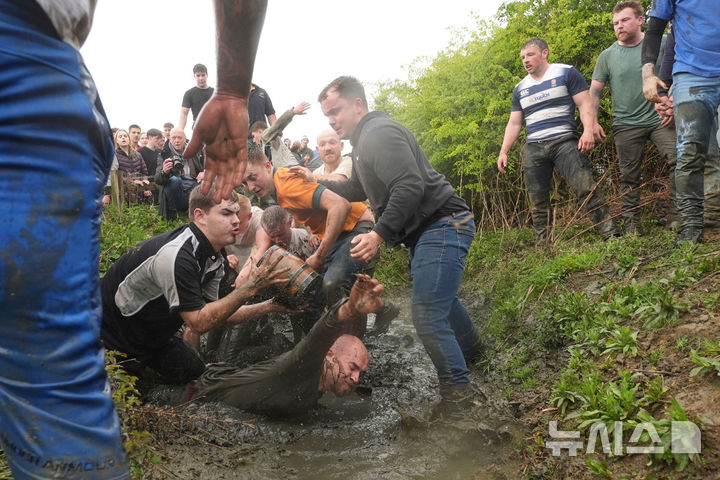 [할러턴=AP/뉴시스] 21일(현지 시간) 영국 할러턴과 메드번 마을 주민들이 전통 '병 차기'(bottle-kicking) 경기를 치르고 있다. 매년 부활절 월요일에 열리는 이 경기에서 참가자들은 약 1갤런(약 3.8리터)의 맥주가 담긴 나무통을 1.6㎞ 공터 양 끝에 있는 자기 마을의 개울로 옮기기 위해 치열하게 몸싸움을 벌인다. 이 행사는 영국 내에서도 독특한 지역 풍습 중 하나로 꼽히며, 마을 공동체의 힘을 보여주는 생생한 전통으로 이어지고 있다. 2025.04.22.