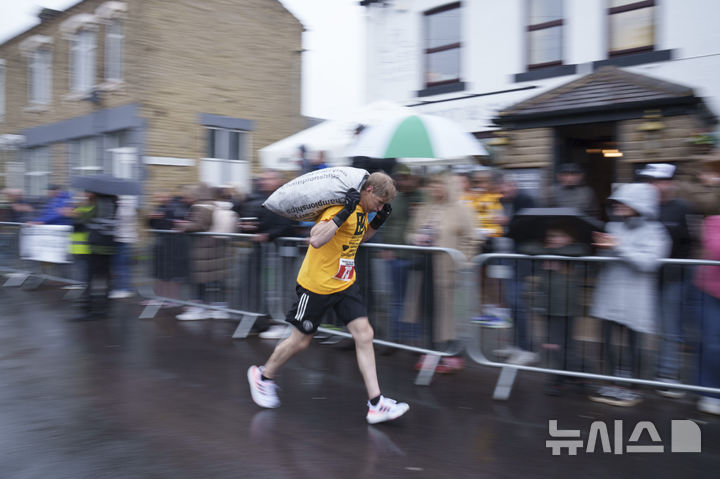 [오세트=AP/뉴시스] 21일(현지 시간) 영국 웨스트요크셔주 오세트에서 열린 석탄 나르기 챔피언십 남자부 참가자가 석탄 자루를 짊어지고 달리고 있다. 1963년에 시작해 매년 부활절 월요일에 열리는 이 행사는 과거 광산 지역의 노동 유산을 기리는 상징적인 행사로, 남자는 50㎏, 여자는 20㎏의 석탄 자루를 짊어지고 1.1㎞ 언덕길을 달린다. 2025.04.22.